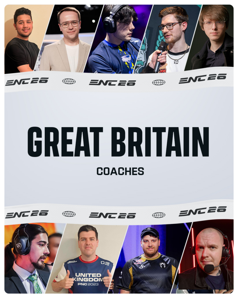 Home > The HUB > News Great Britain announces coaches for Esports Nations Cup 2026: Mac, Neilzinho and more confirmed Great Britain announces coaches for Esports Nations Cup 2026: Mac, Neilzinho and more confirmed British Esports 5 min read | 23 Apr 2026 The esports collective representing Great Britain at the inaugural Esports Nations Cup (ENC) has announced its first line-up of coaches across several game titles. The coaches are as follows: DOTA 2 – Ivan ‘Kidaro’ Bondarev Honor of Kings – Mitchell ‘BLAM’ Bird League of Legends – James ‘Mac’ MacCormack Mobile Legends Bang Bang – Cameron ‘Psy’ Vanloo PUBG – Justin ‘MiracU’ McNally PUBG Mobile – Abhi ‘Abhi’ Sharma Rainbow Six: Siege – Ryan ‘KangruKenny’ Morrow Rocket League – Dylan ‘eekso’ Pickering Valorant – Neil ‘Neilzinho’ Finlay Meet the coaches who will lead Great Britain at the inaugural @ENC_EN!CS2 & Apex Legends coaches will be announced with their rosters at a later date.Which title are you most excited for? pic.twitter.com/wNMjQD1xGh— Team Great Britain Esports (@TeamGBR_Esports) April 23, 2026 Coaches in Counter-Strike 2 and Apex Legends will be announced at a later date, given these games will have national qualifiers. The other Esports Nations Cup titles – Street Fighter 6, chess, FATAL FURY: City of the Wolves, FC 26 and Trackmania – do not have coach slots. The news comes a few weeks after British Esports, Esports Wales, Fnatic, Scottish Esports, The FA via England Gaming and UKETC united to represent Great Britain at the Esports Nations Cup 2026, with Jeff Simpkins appointed National Team Manager. He is leaning on industry veterans such as Michael ‘ODEE’ O’Dell (Scan Computers Director of Gaming and Esports), Grant Rousseau (NIP Group COO) and Saahib Reehal (Esports and Gaming Lead at The FA) for support. With the coaches now selected in each game title, Jeff will work closely with them on player selection, with teams to be announced at a later date. However, several players featured in the ENC GB announcement video, including Jack ‘ApparentlyJack’ Benton (Rocket League Player for Geekay Esports), Jack ‘Doki’ Robertson (Rainbow Six: Siege Player for G2 Esports) and more. The Esports Nations Cup (ENC) is a biennial global esports competition created by the Esports World Cup Foundation (EWCF) that brings national pride to the world stage. Launching in Riyadh, Saudi Arabia, in November 2026, before moving to a rotating city model, the ENC will feature the world’s best players competing not for their Clubs, but for their countries and territories, across a line-up of leading esports titles. It’s backed by a three-part funding commitment totaling $45m, with $20m in prize money paid directly to players and coaches, $5m in club incentives for esports clubs that release and enable their professional players to participate in ENC, and an additional $20m through the previously announced ENC Development Fund. To stay up to date with the GB esports activities, check out instagram.com/greatbritainenc, youtube.com/@greatbritainenc, tiktok.com/@greatbritainenc and x.com/greatbritainenc News Apex Legends British Esports Community News Great Britain News League of Legends News Rocket League Valorant Share: Link copied British Esports View all articles